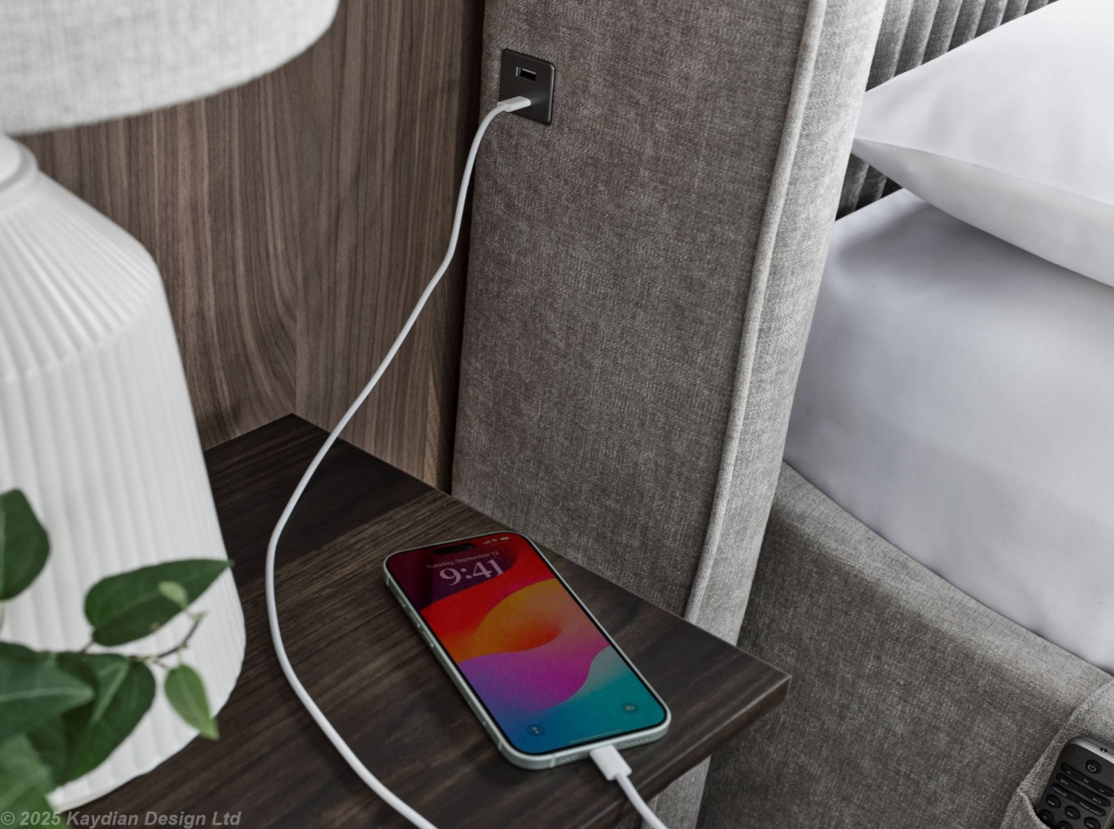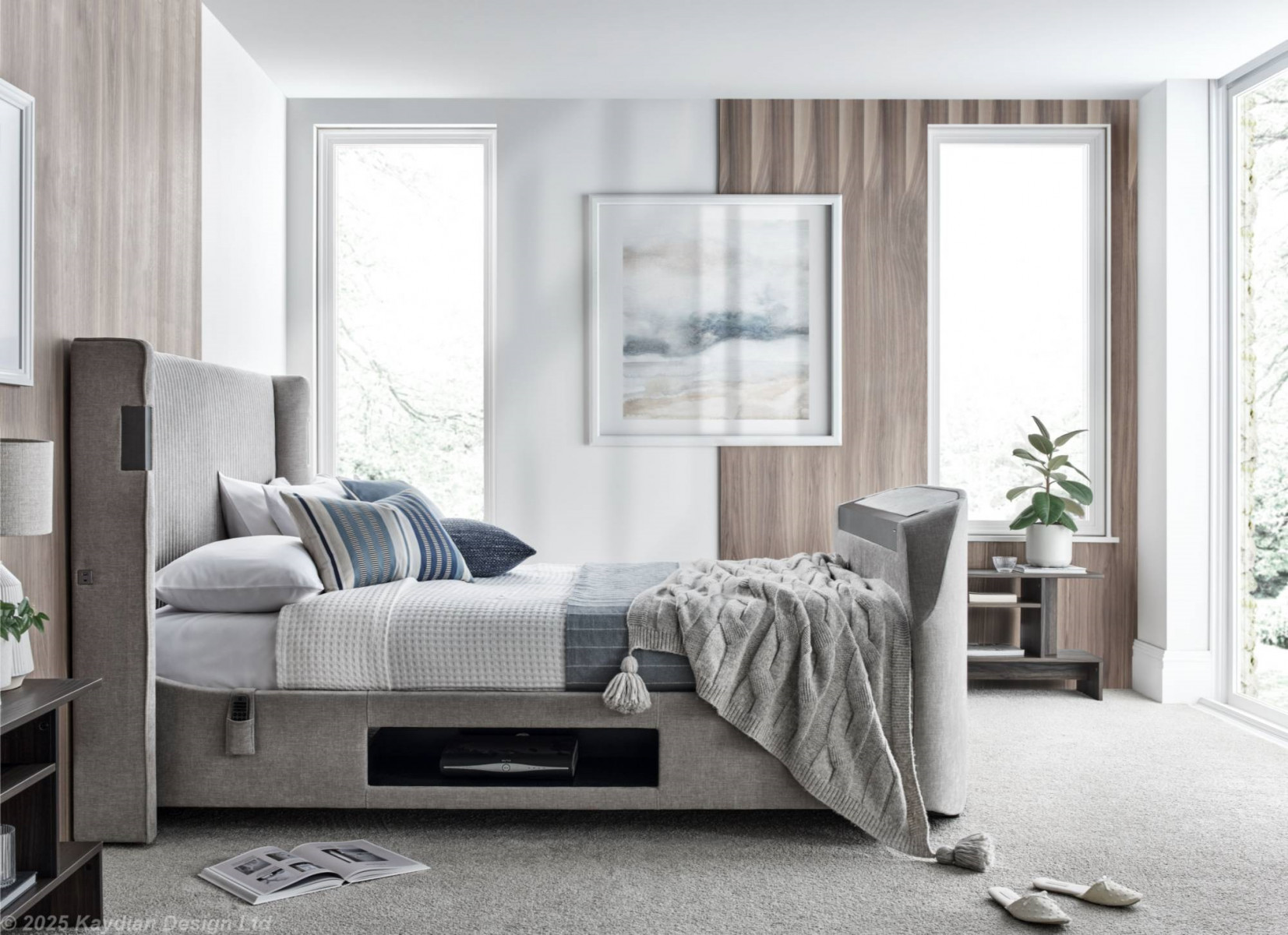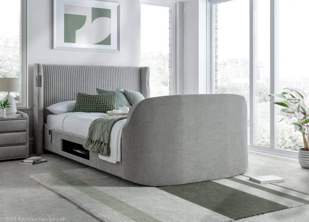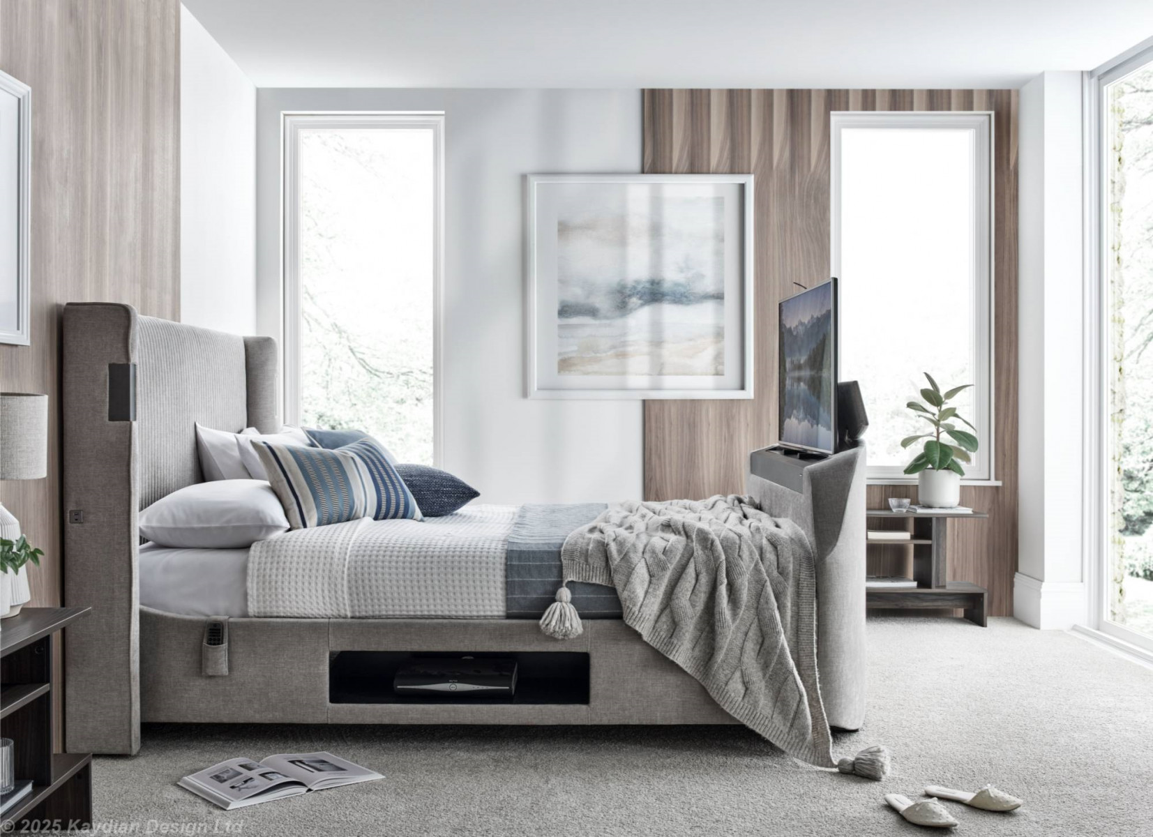 The Darras TV bed frame is equipped with a quiet function mechanism, and its slim foot end is designed to house a 43” screen with ease.