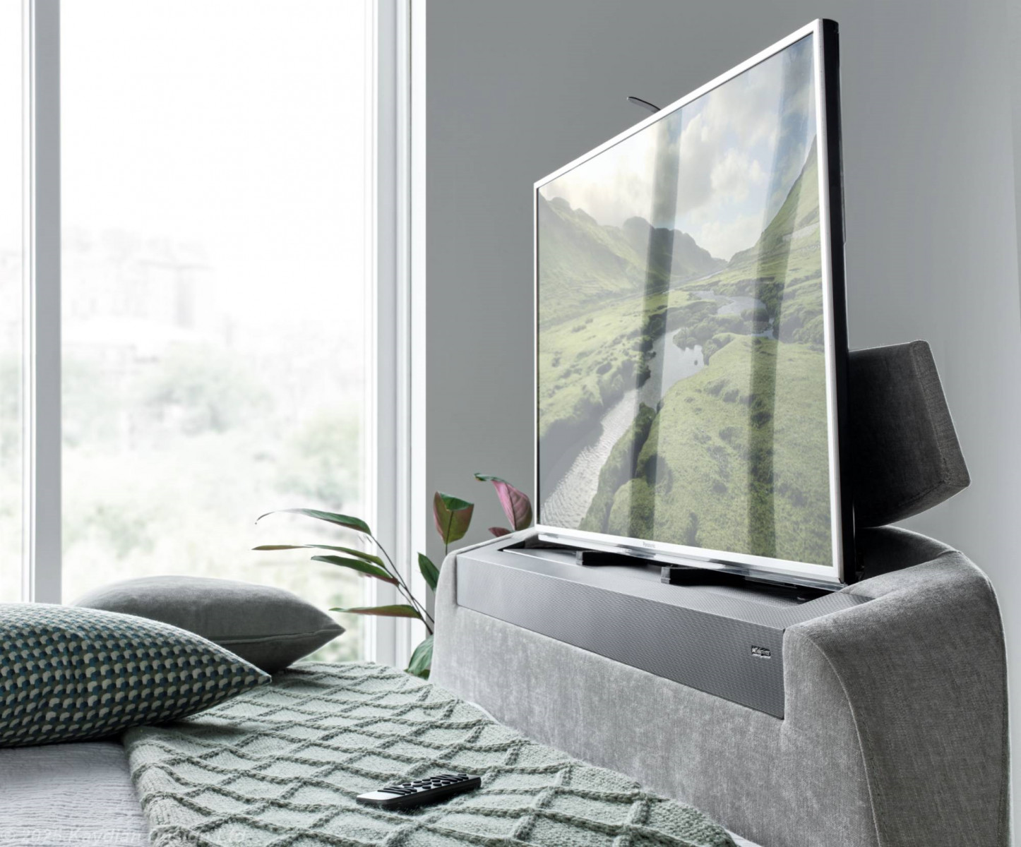 At its slim foot end, a whisper-quiet mechanism discreetly houses a 43″ TV (subject to TV dimensions and port fittings), seamlessly elevating at the press of a button.