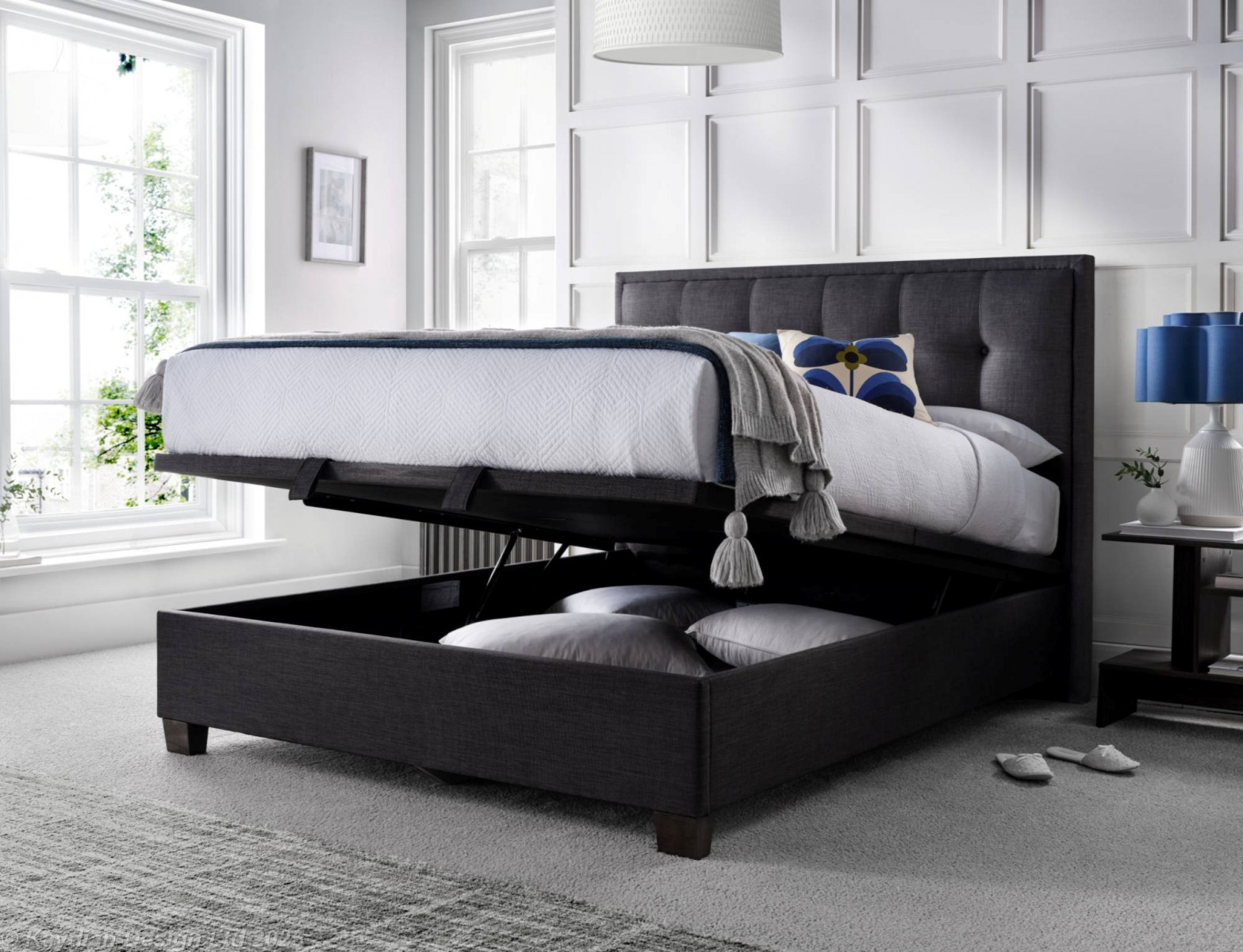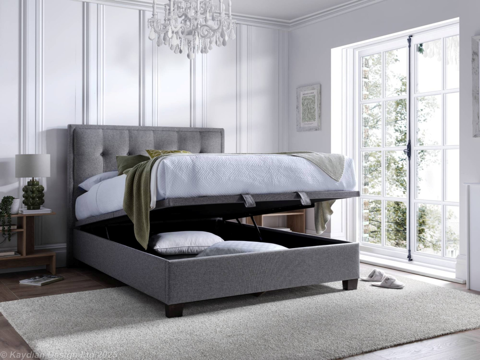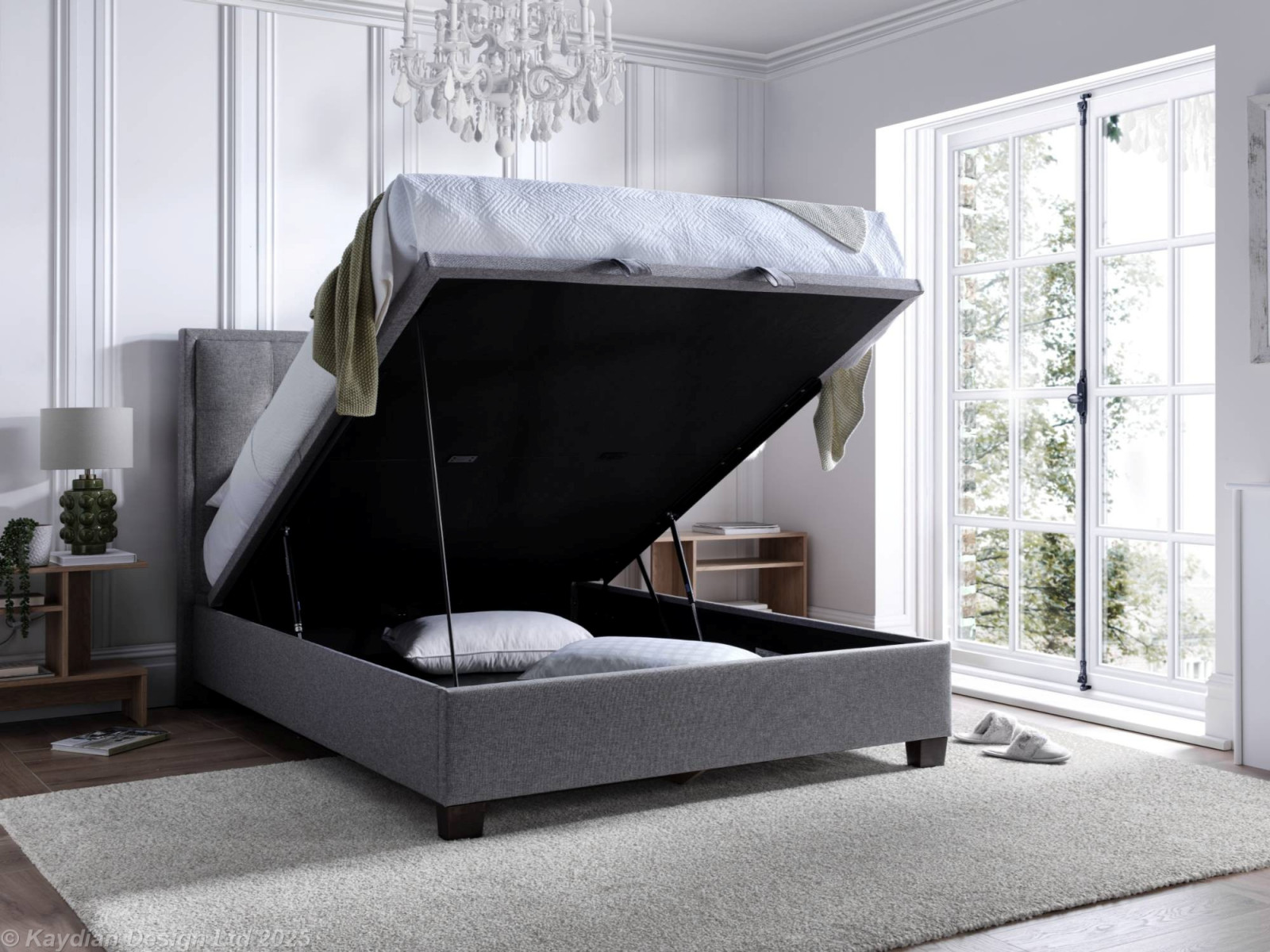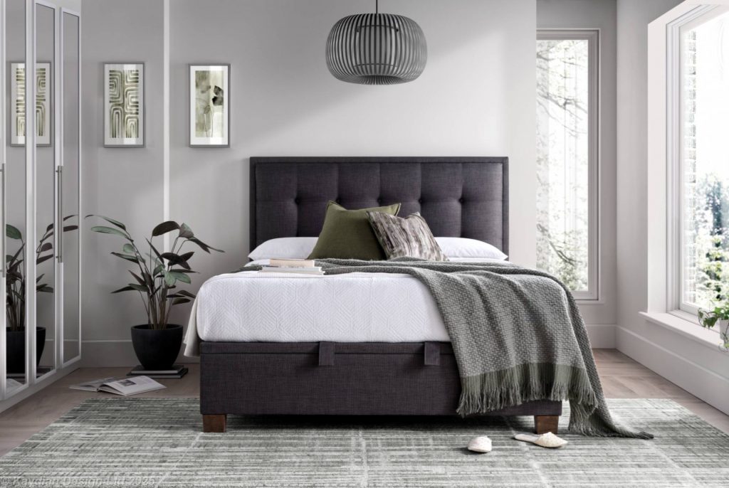 Upholstered in a soft shade of grey or slate fabric, the Falfield serves as a versatile storage bed.