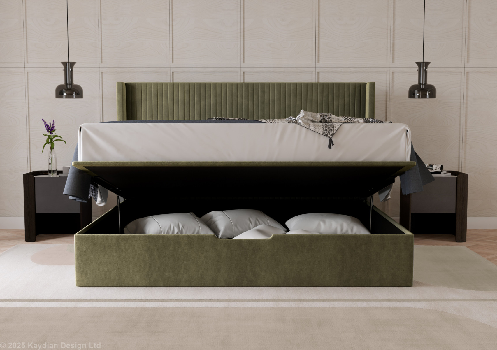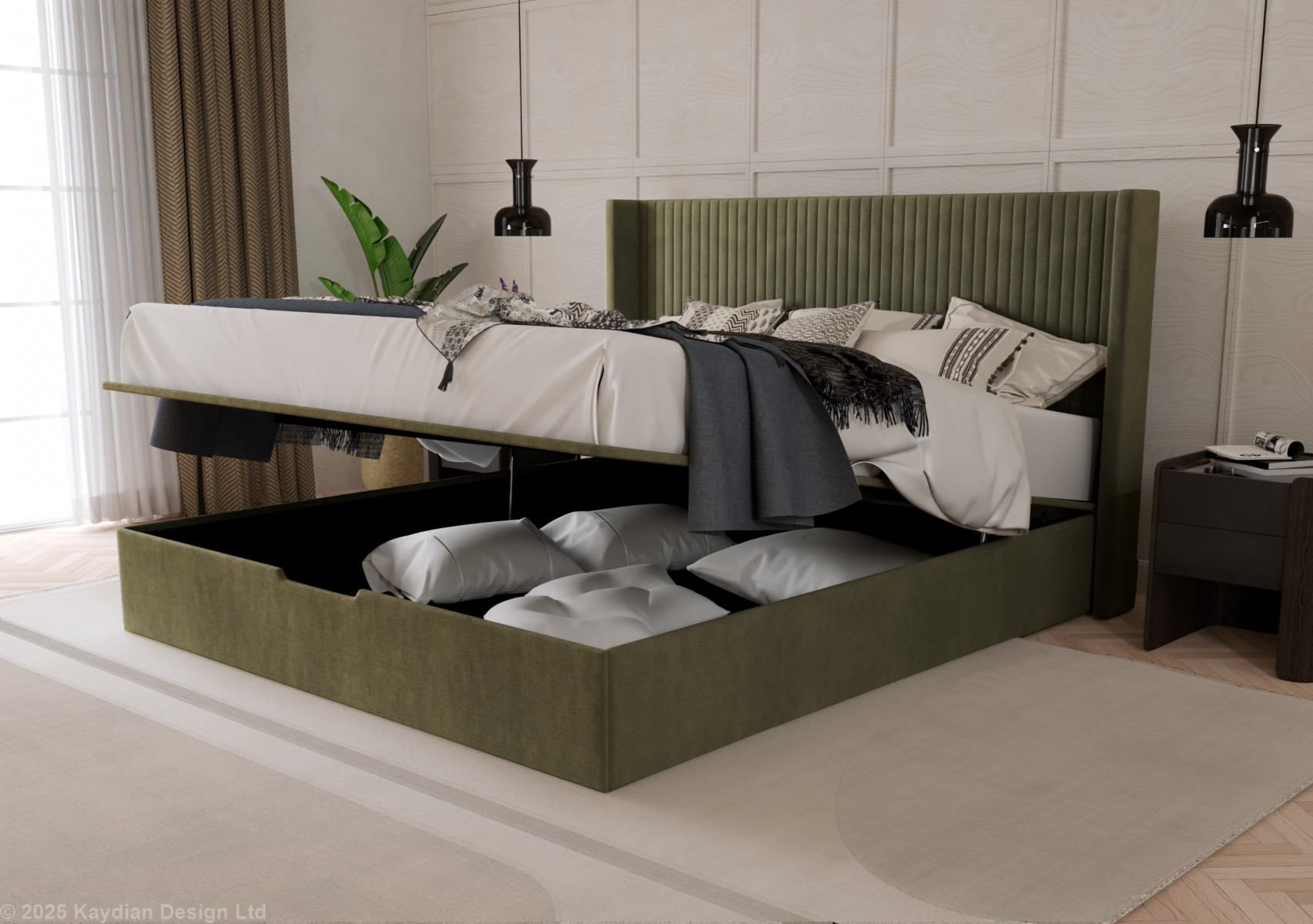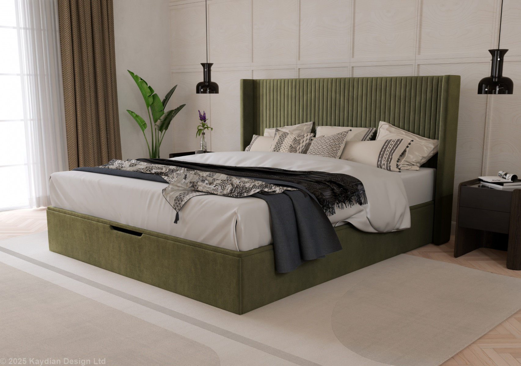 Upholstered in a soft-touch fabric, the Hartley comes in two sophisticated shades, Taupe and Olive, making it easy to complement a variety of bedroom interiors. The striking winged head features elegant vertical stitching, creating a refined focal point while providing comfortable support for sitting up in bed.